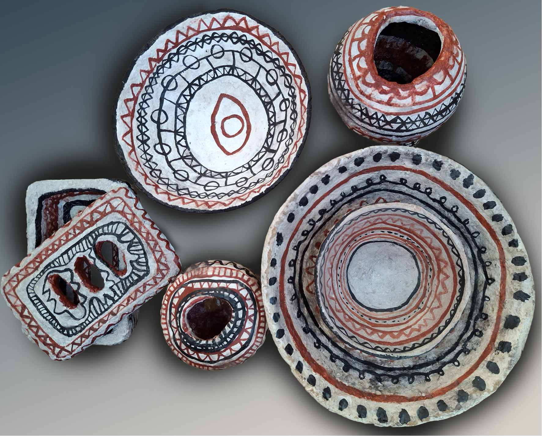 Experimenting with paper clay has led me to create containers that echo prehistoric artifacts, both in their form and in their decorative patterns. As I work, I find myself thinking about the rituals and habits of everyday life thousands of years ago — the role such objects might have played in daily routines, and how they might have shaped social interactions.